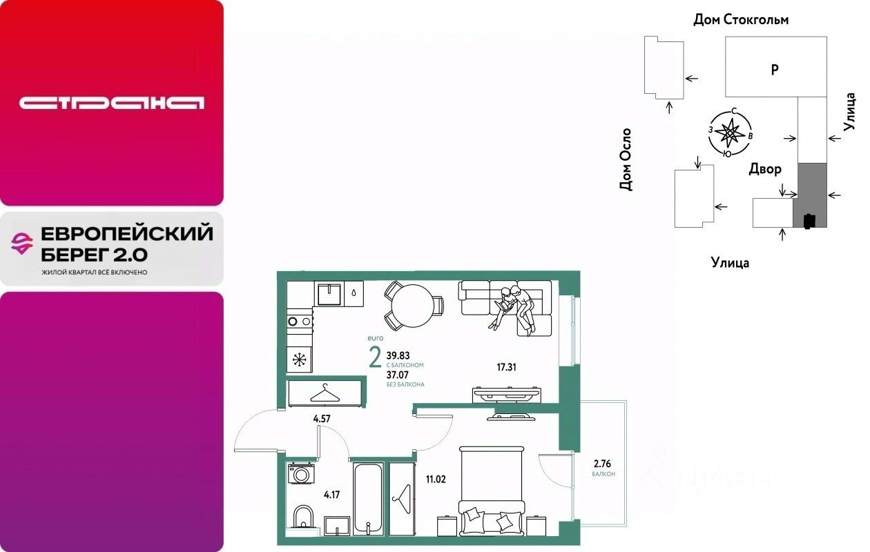 Продается 2комнатная квартира на 9 этаже от застройщика Страна Девелопмент. Площадь квартиры 39,83 кв. м.