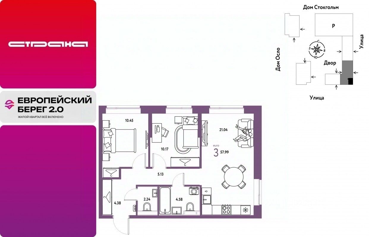 Продается 3комнатная квартира на 10 этаже от застройщика Страна Девелопмент. Площадь квартиры 57,99 кв. м.