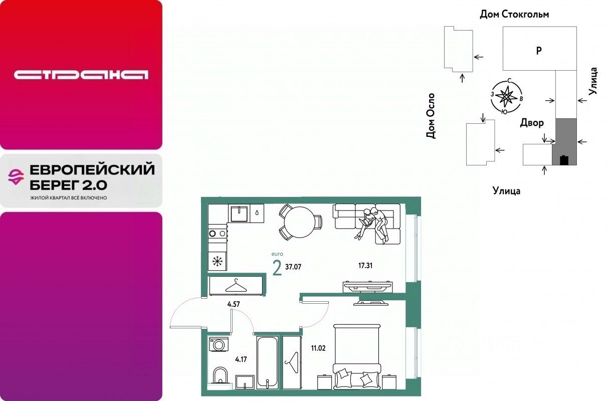Продается 2комнатная квартира на 12 этаже от застройщика Страна Девелопмент. Площадь квартиры 37,07 кв. м.