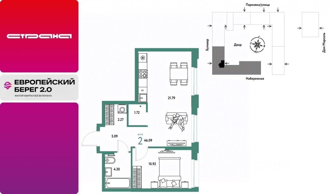 Продается 2комнатная квартира на 2 этаже от застройщика Страна Девелопмент. Площадь квартиры 46,09 кв. м. Стоимость указана без учета акций.