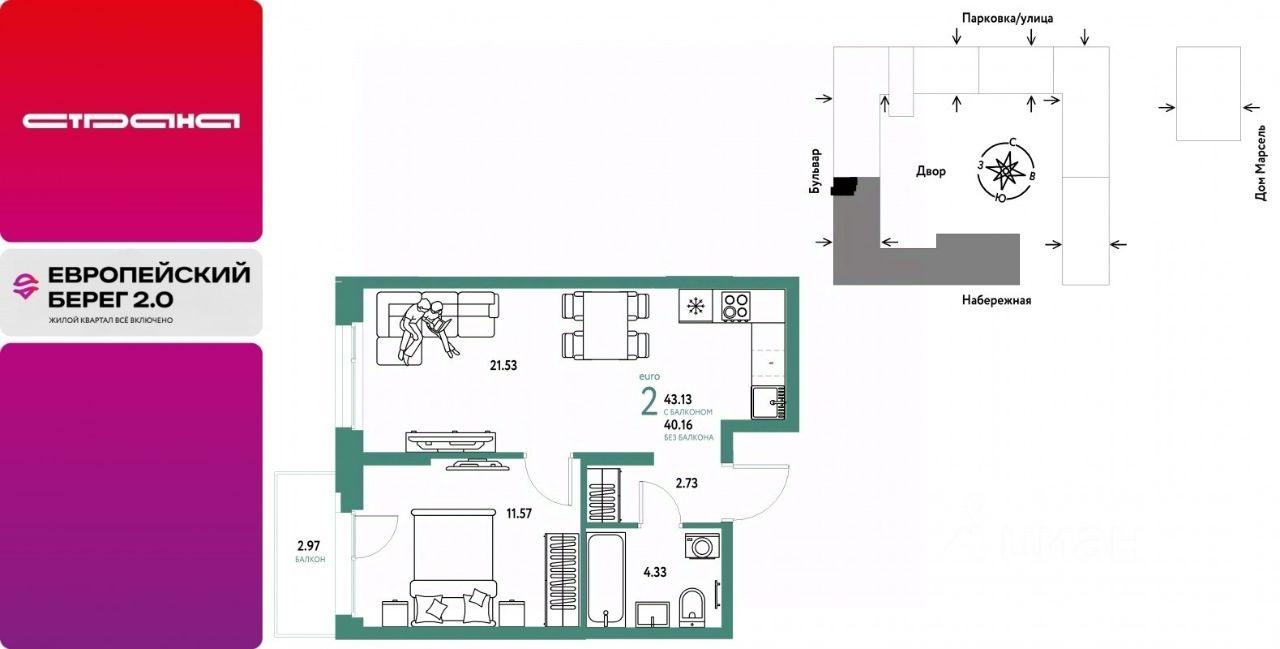 Продается 2комнатная квартира на 5 этаже от застройщика Страна Девелопмент. Площадь квартиры 43,13 кв. м. Стоимость указана без учета акций.