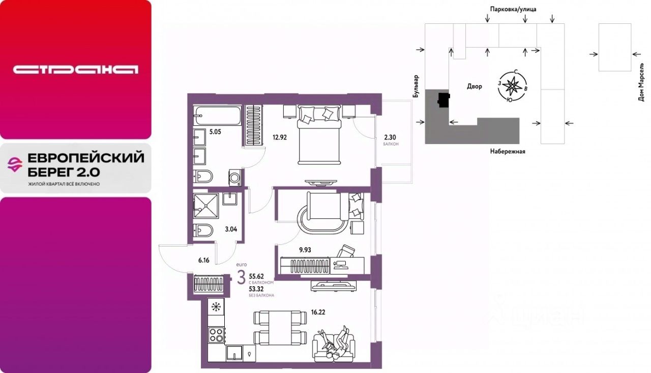Продается 3комнатная квартира на 10 этаже от застройщика Страна Девелопмент. Площадь квартиры 55,62 кв. м. Стоимость указана без учета акций.