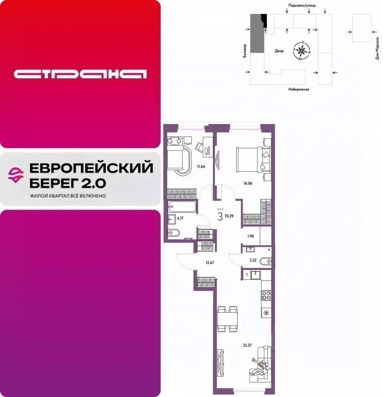Продается 3комнатная квартира на 2 этаже от застройщика Страна Девелопмент. Площадь квартиры 70,29 кв. м. Стоимость указана без учета акций.