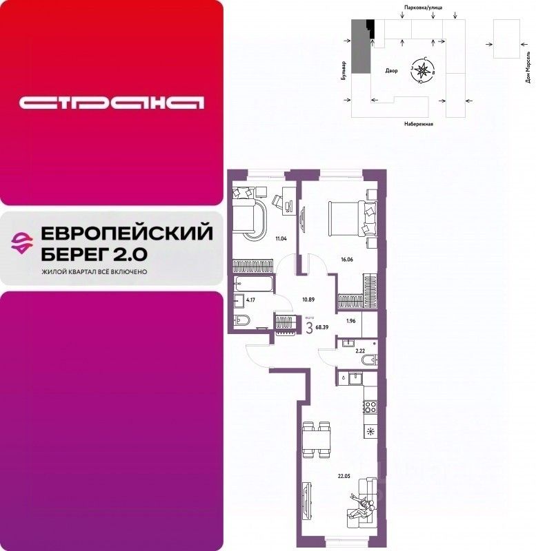 Продается 3комнатная квартира на 10 этаже от застройщика Страна Девелопмент. Площадь квартиры 68,39 кв. м. Стоимость указана без учета акций.