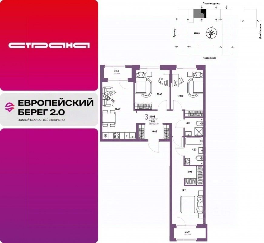 Продается 3комнатная квартира на 2 этаже от застройщика Страна Девелопмент. Площадь квартиры 81,08 кв. м. Стоимость указана без учета акций.