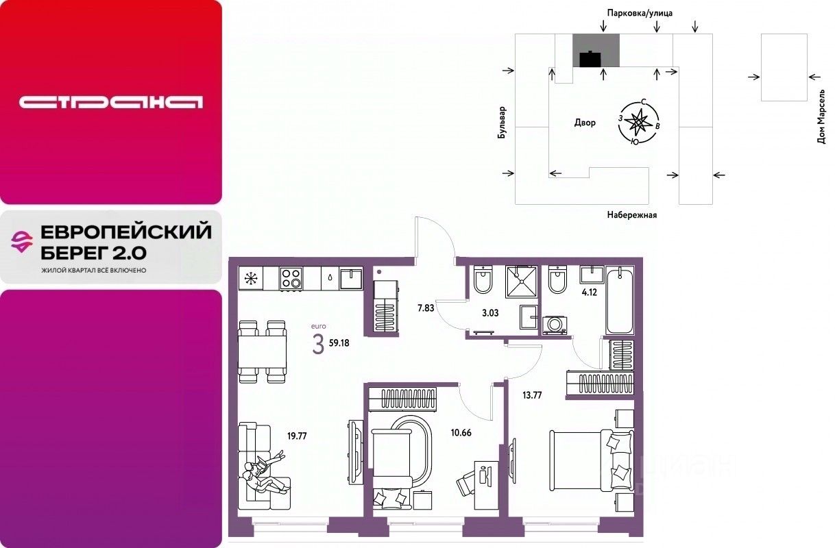 Продается 3комнатная квартира на 4 этаже от застройщика Страна Девелопмент. Площадь квартиры 59,18 кв. м. Стоимость указана без учета акций.