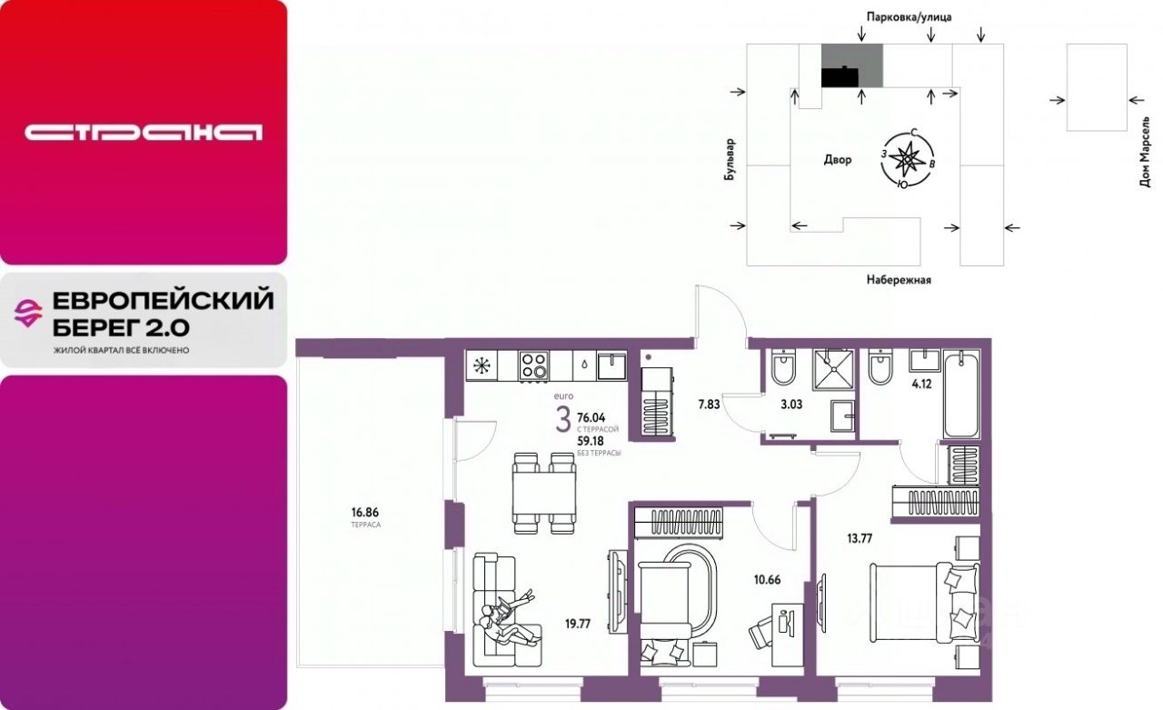 Продается 3комнатная квартира на 13 этаже от застройщика Страна Девелопмент. Площадь квартиры 76,04 кв. м. Стоимость указана без учета акций.