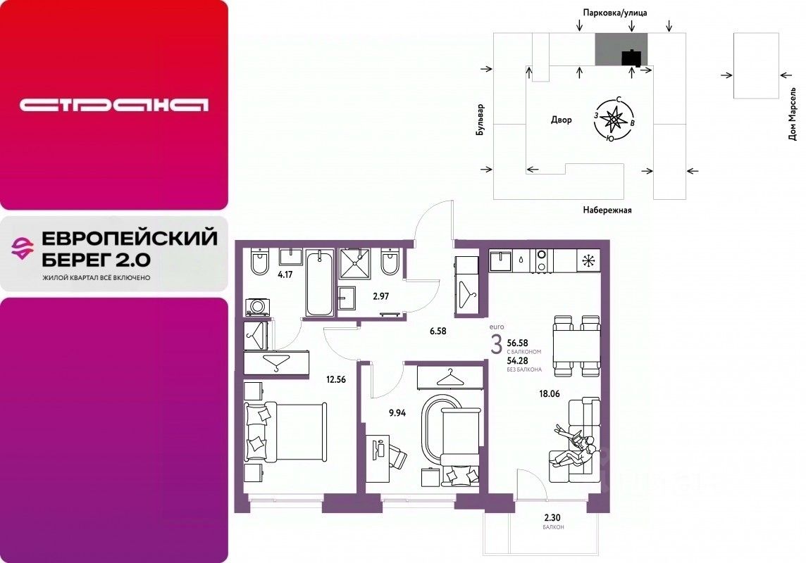 Продается 3комнатная квартира на 3 этаже от застройщика Страна Девелопмент. Площадь квартиры 56,58 кв. м. Стоимость указана без учета акций.