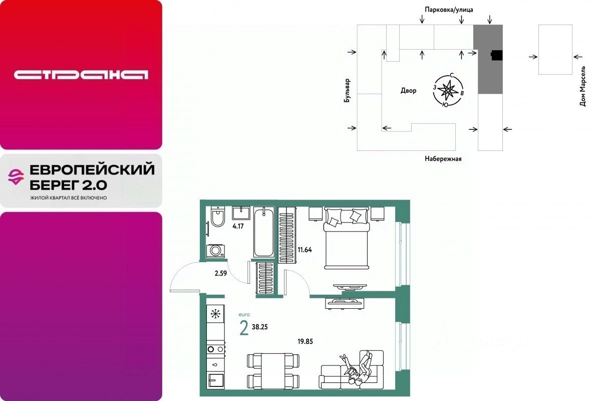 Продается 2комнатная квартира на 9 этаже от застройщика Страна Девелопмент. Площадь квартиры 38,25 кв. м. Стоимость указана без учета акций.