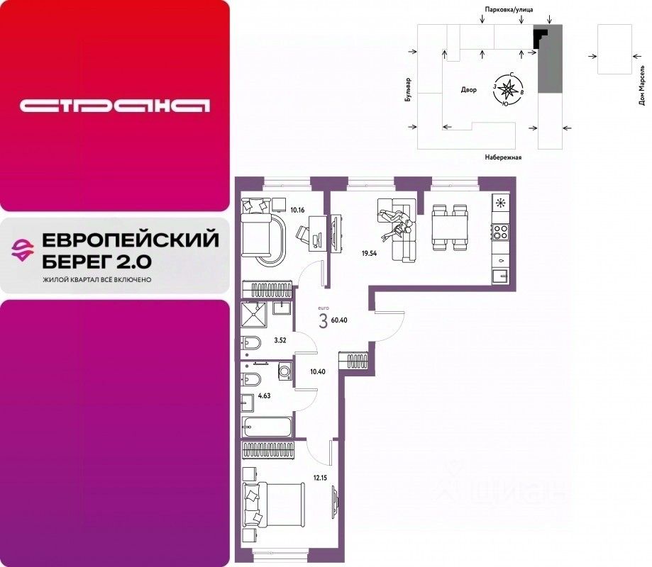 Продается 3комнатная квартира на 12 этаже от застройщика Страна Девелопмент. Площадь квартиры 60,4 кв. м. Стоимость указана без учета акций.