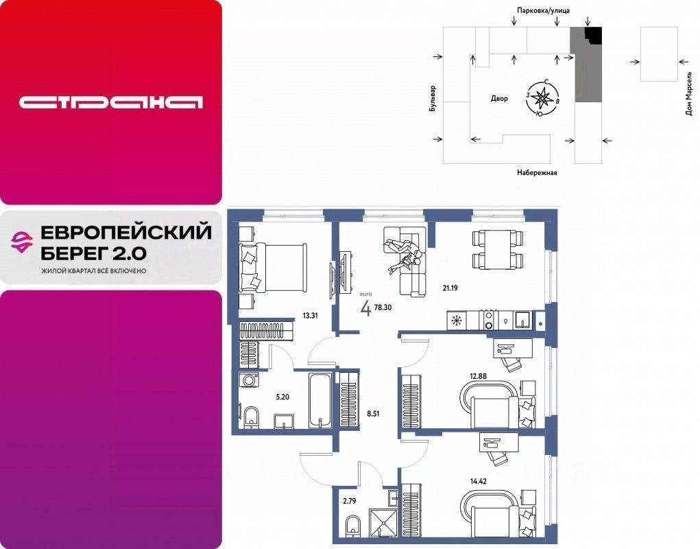 Продается 4комнатная квартира на 12 этаже от застройщика Страна Девелопмент. Площадь квартиры 78,3 кв. м. Стоимость указана без учета акций.