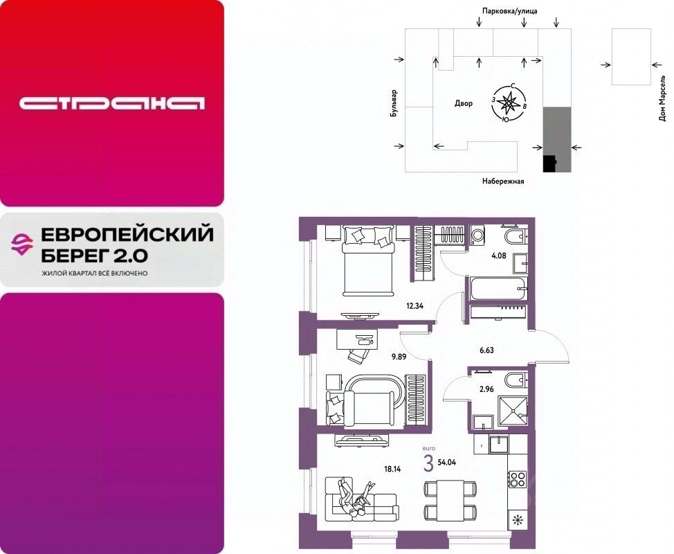 Продается 3комнатная квартира на 2 этаже от застройщика Страна Девелопмент. Площадь квартиры 54,04 кв. м. Стоимость указана без учета акций.