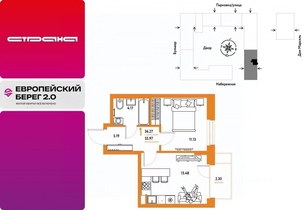 Продается 1комнатная квартира на 3 этаже от застройщика Страна Девелопмент. Площадь квартиры 36,27 кв. м. Стоимость указана без учета акций.