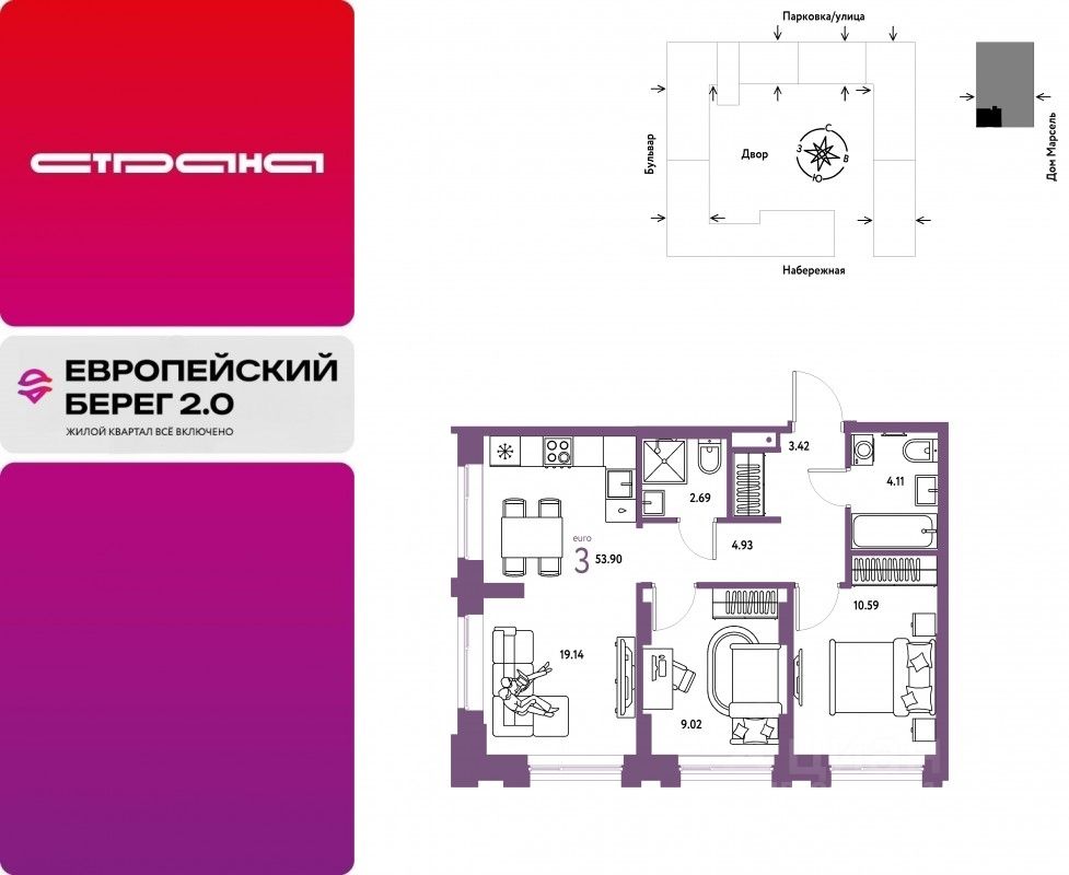 Продается 3комнатная квартира на 5 этаже от застройщика Страна Девелопмент. Площадь квартиры 53,9 кв. м. Стоимость указана без учета акций.