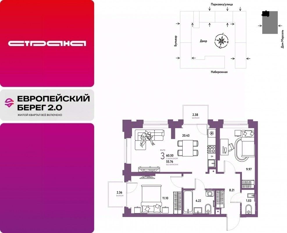 Европейский берег 2.0. — это продолжение легендарного жилого комплекса Европейский берег. Он включает все, что нужно для жизни, и даже больше. Этот квартал для тех, кто не готов тратить время на ненужное, жертвовать одним ради другого. Для тех, кто хочет получить все и сразу. Именно поэтому генеральная идея проекта — жилой квартал все включено. Все преимущества включены. Никаких исключений.