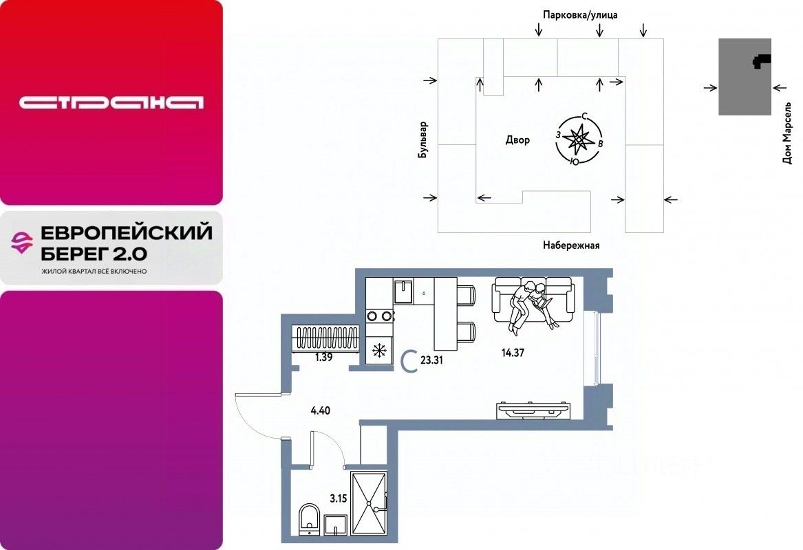 Продается 1комнатная квартира на 20 этаже от застройщика Страна Девелопмент. Площадь квартиры 23,31 кв. м. Стоимость указана без учета акций.