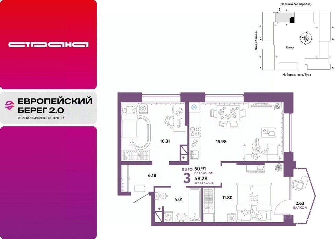 Продается 3комнатная квартира в новом ЖК "Европейский берег". Общая площадь квартиры 50,91 кв. м. Сдача — в 4 квартале 2025 года.