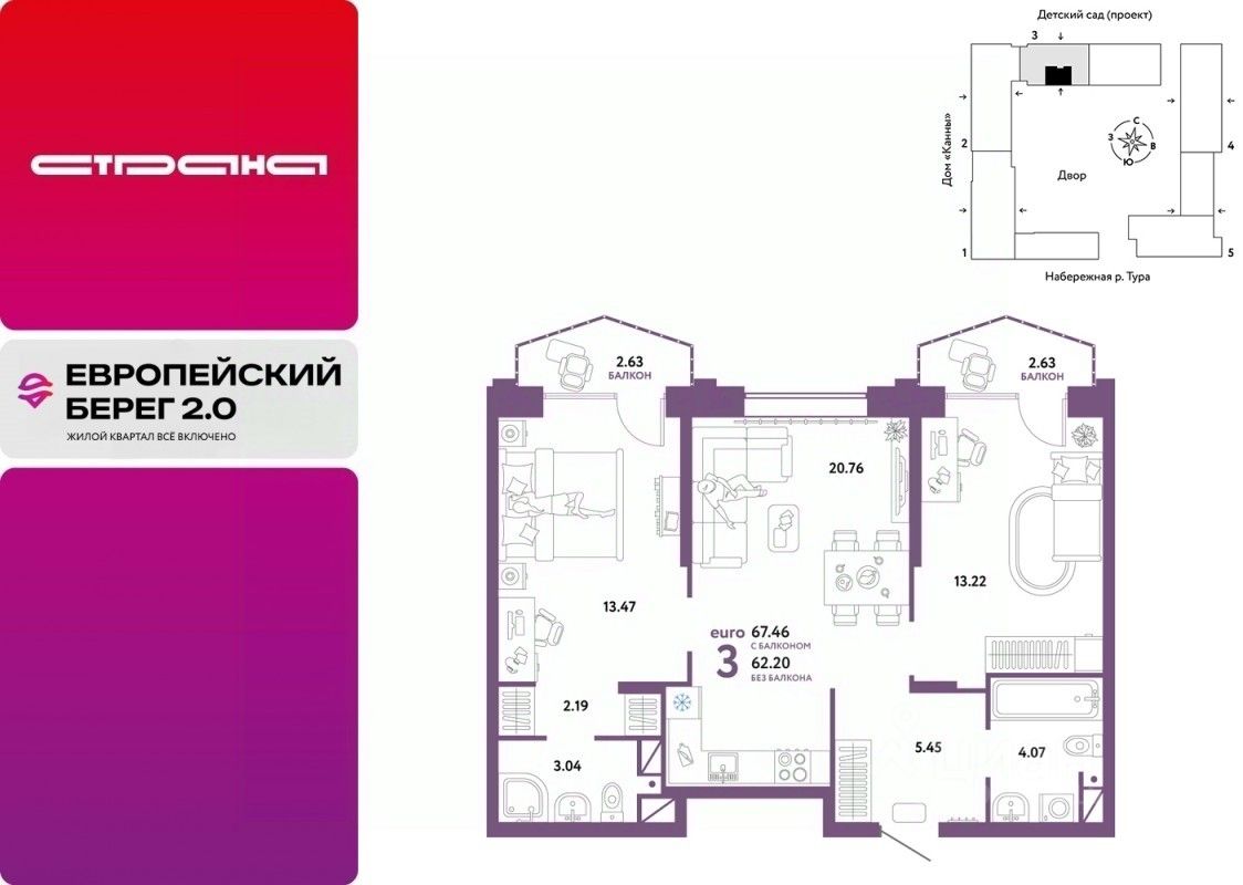 Продается 3комнатная квартира в новом ЖК "Европейский берег". Общая площадь квартиры 67,46 кв. м. Сдача — в 4 квартале 2025 года.