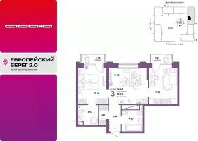 Продается 3комнатная квартира в новом ЖК "Европейский берег". Общая площадь квартиры 56,41 кв. м. Сдача — в 4 квартале 2025 года.