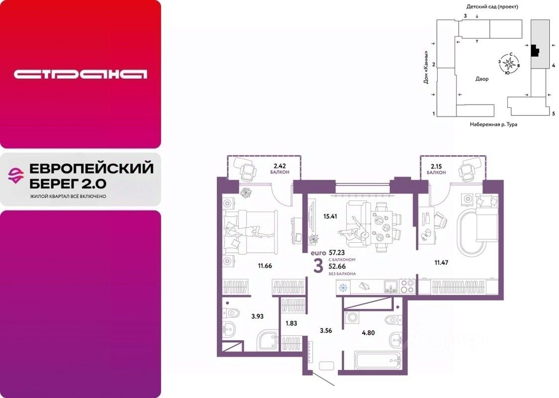 Продается 3комнатная квартира в новом ЖК "Европейский берег". Общая площадь квартиры 57,23 кв. м. Сдача — в 4 квартале 2025 года.
