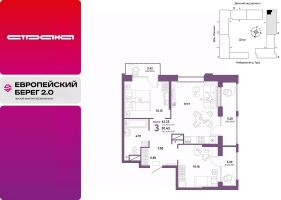 Продается 3комнатная квартира в новом ЖК "Европейский берег". Общая площадь квартиры 61,25 кв. м. Сдача — в 4 квартале 2025 года.