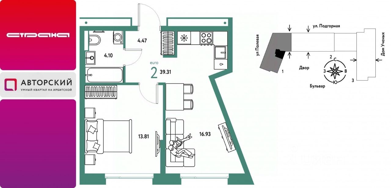 Продается 2комнатная квартира на 2 этаже от застройщика Страна Девелопмент. Площадь квартиры 39,31 кв. м.