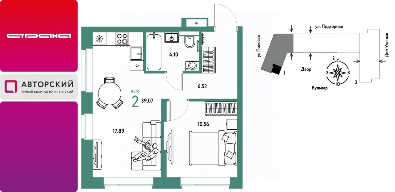 Продается 2комнатная квартира на 5 этаже от застройщика Страна Девелопмент. Площадь квартиры 39,07 кв. м.