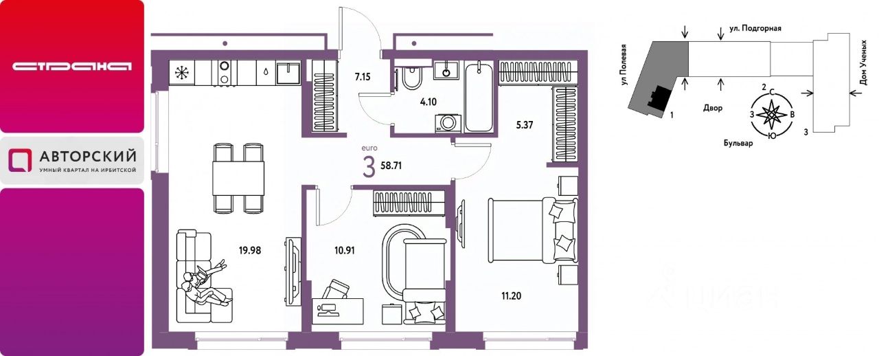 Продается 3комнатная квартира на 11 этаже от застройщика Страна Девелопмент. Площадь квартиры 58,71 кв. м.