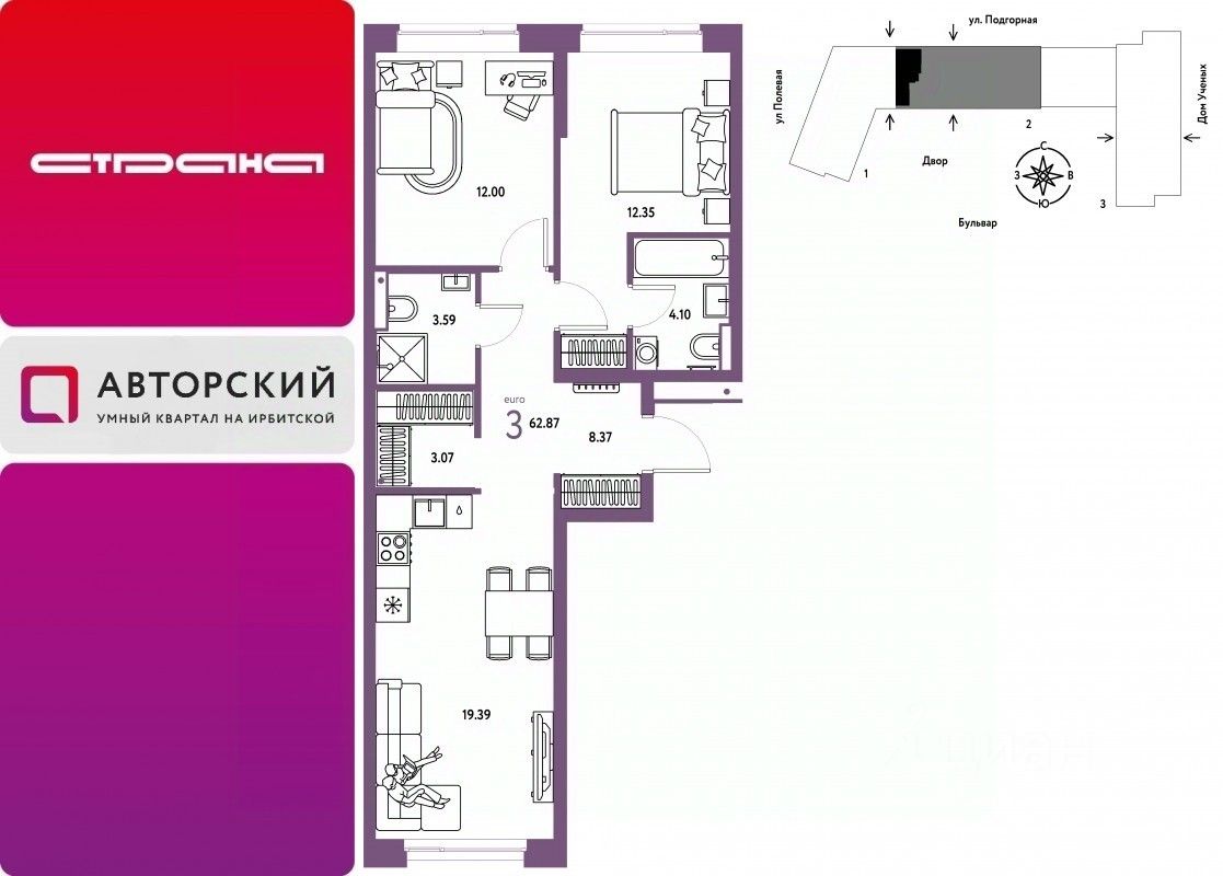 Продается 3комнатная квартира на 2 этаже от застройщика Страна Девелопмент. Площадь квартиры 62,87 кв. м.
