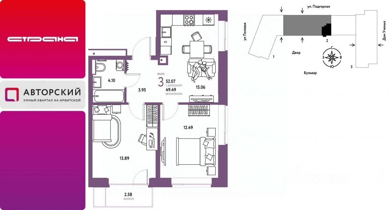 Продается 3комнатная квартира на 9 этаже от застройщика Страна Девелопмент. Площадь квартиры 52,07 кв. м.