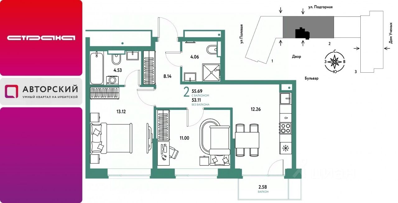 Продается 2комнатная квартира на 9 этаже от застройщика Страна Девелопмент. Площадь квартиры 55,69 кв. м.