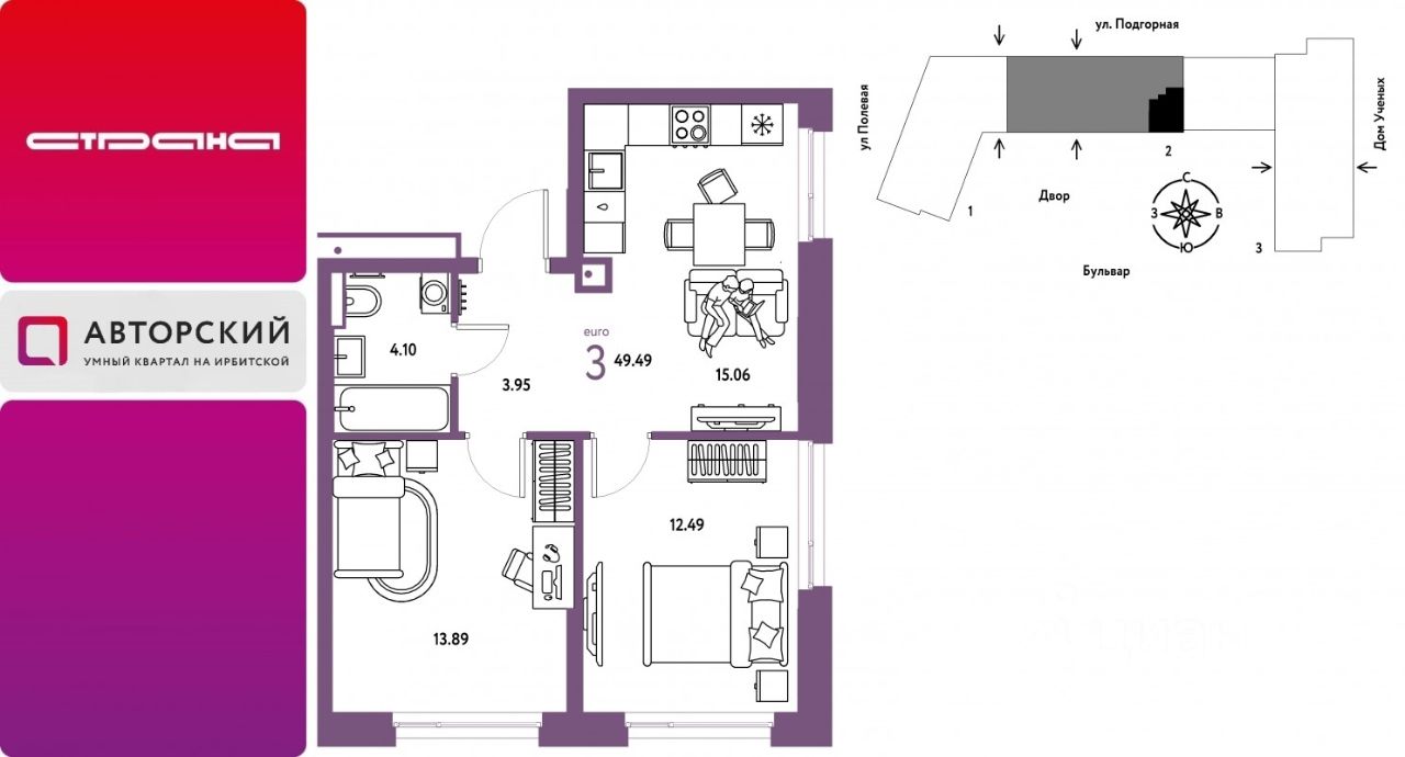 Продается 3комнатная квартира на 10 этаже от застройщика Страна Девелопмент. Площадь квартиры 49,49 кв. м.