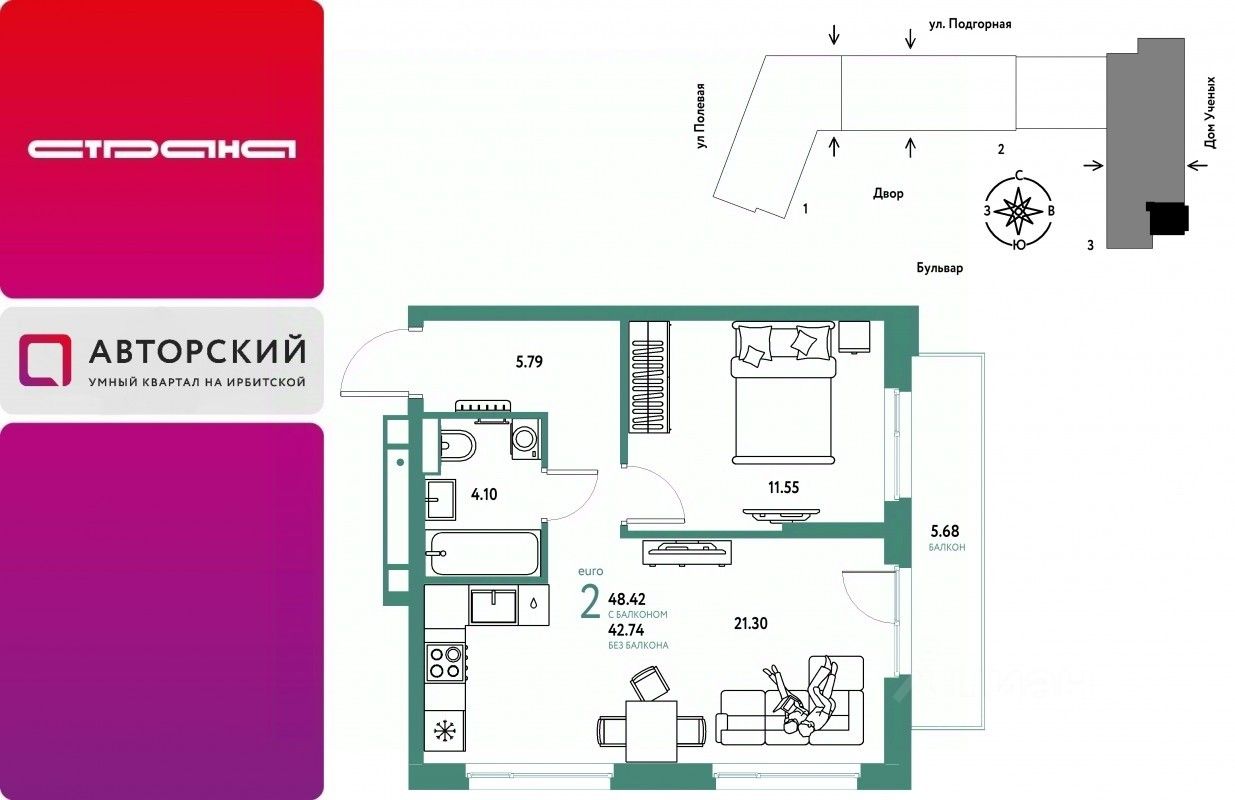 Продается 2комнатная квартира на 7 этаже от застройщика Страна Девелопмент. Площадь квартиры 48,42 кв. м.
