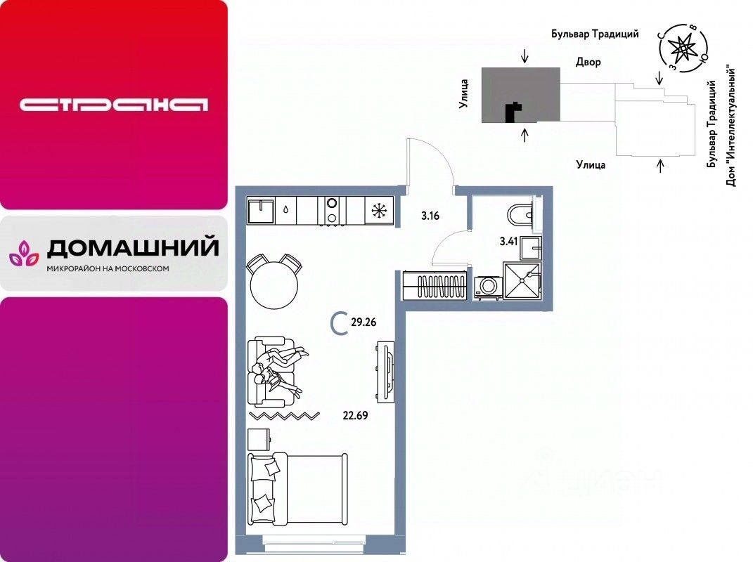 Продается 1комнатная квартира на 7 этаже от застройщика Страна Девелопмент. Площадь квартиры 29,26 кв. м. Стоимость указана без учета акций.