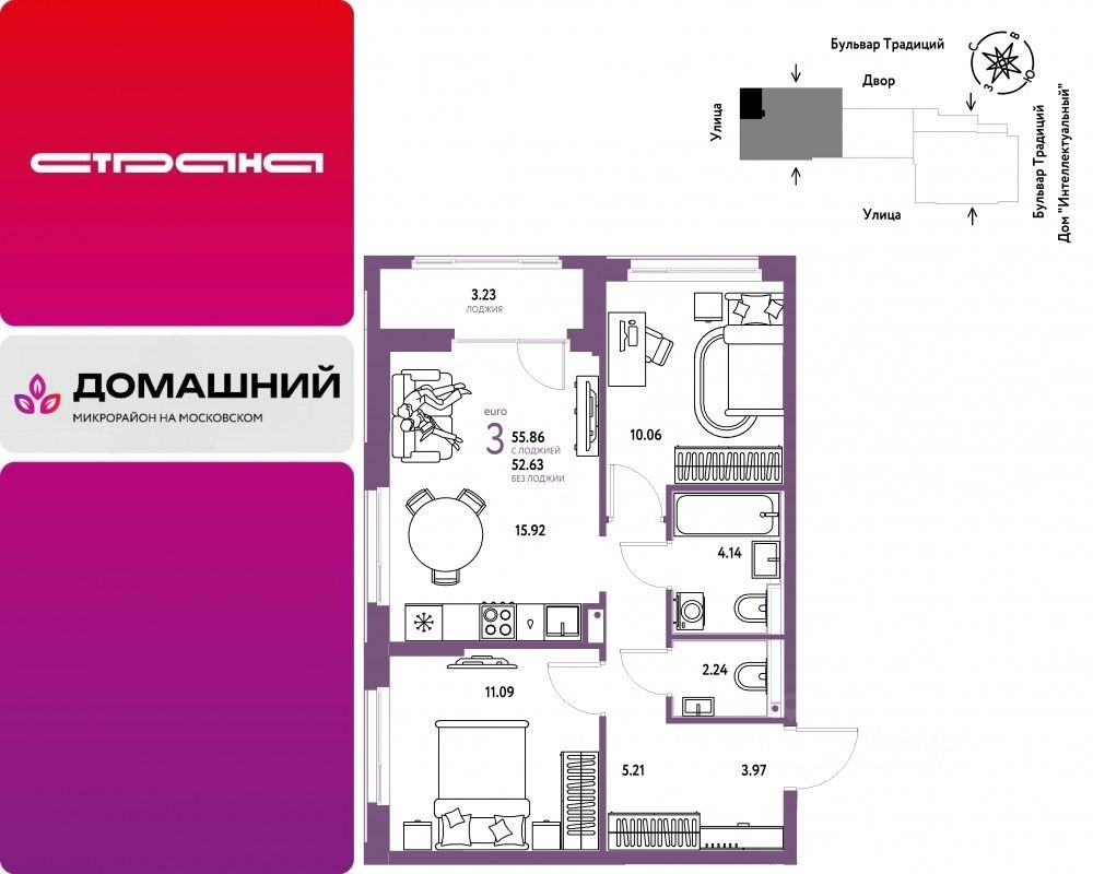 Продается 3комнатная квартира на 12 этаже от застройщика Страна Девелопмент. Площадь квартиры 55,86 кв. м. Стоимость указана без учета акций.