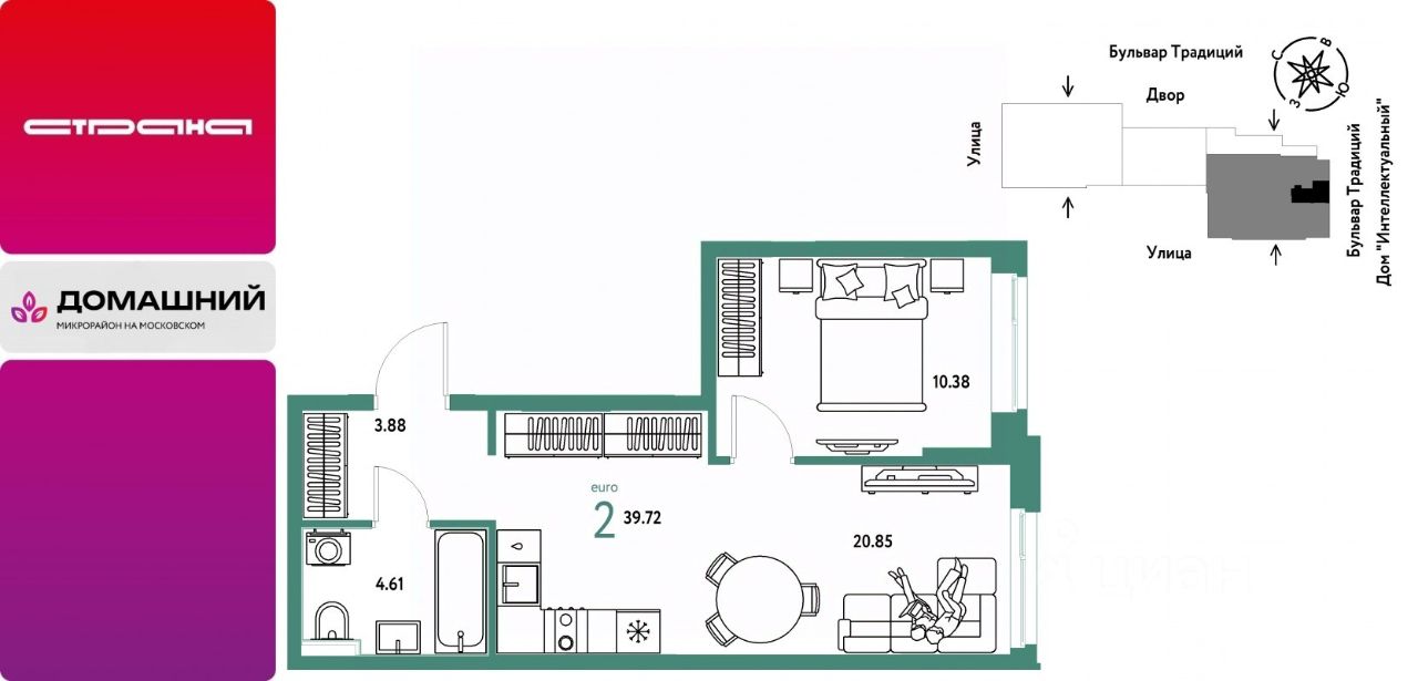 Продается 2комнатная квартира на 3 этаже от застройщика Страна Девелопмент. Площадь квартиры 39,72 кв. м. Стоимость указана без учета акций.