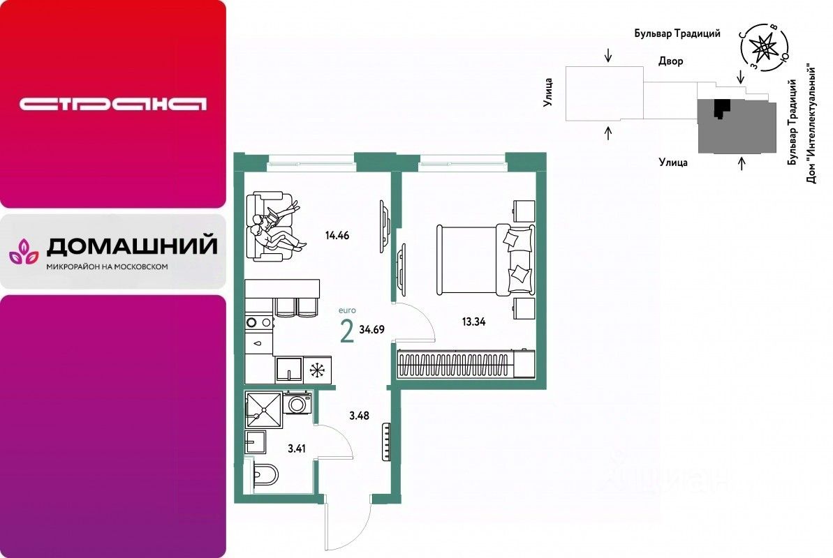 Продается 2комнатная квартира на 15 этаже от застройщика Страна Девелопмент. Площадь квартиры 34,69 кв. м. Стоимость указана без учета акций.