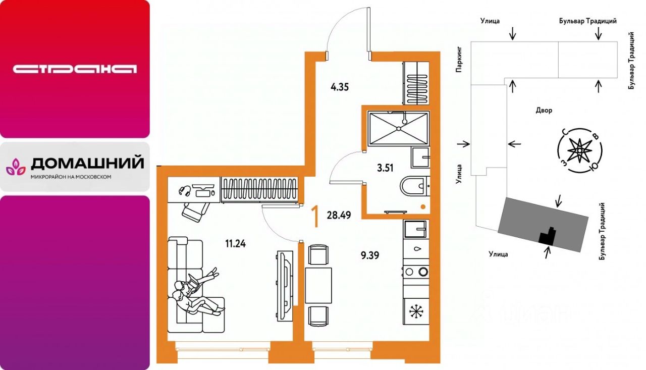 Продается 1комнатная квартира на 10 этаже от застройщика Страна Девелопмент. Площадь квартиры 28,49 кв. м.