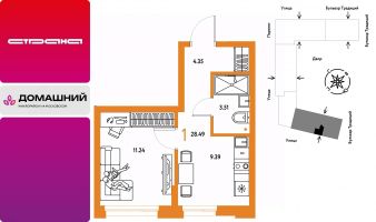 Продается 1комнатная квартира на 12 этаже от застройщика Страна Девелопмент. Площадь квартиры 28,49 кв. м.