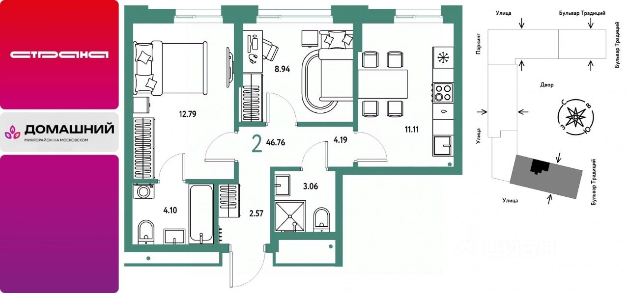 Продается 2комнатная квартира на 15 этаже от застройщика Страна Девелопмент. Площадь квартиры 46,76 кв. м.