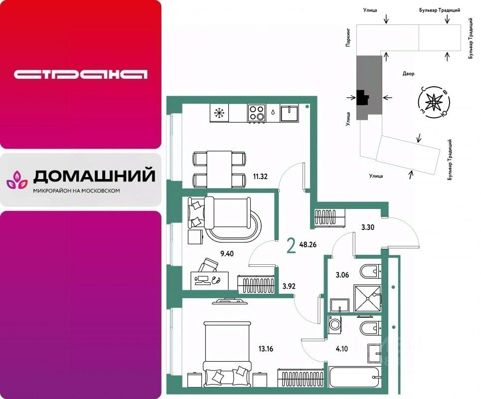Продается 2комнатная квартира на 2 этаже от застройщика Страна Девелопмент. Площадь квартиры 48,26 кв. м.