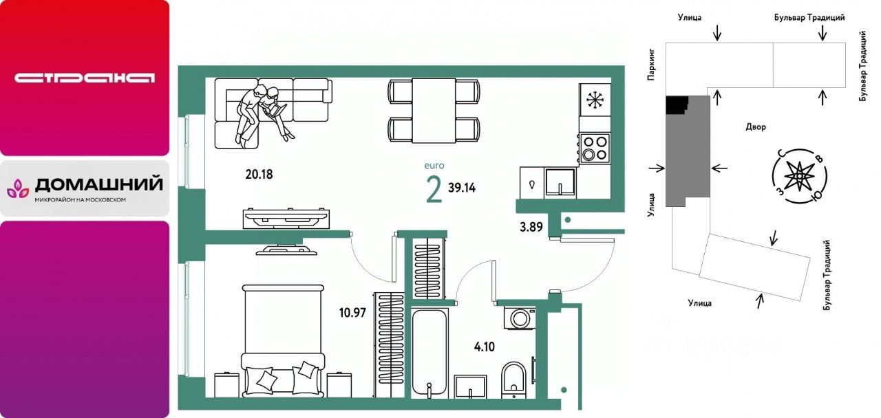 Продается 2комнатная квартира на 2 этаже от застройщика Страна Девелопмент. Площадь квартиры 39,14 кв. м.