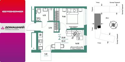 Продается 2комнатная квартира на 4 этаже от застройщика Страна Девелопмент. Площадь квартиры 33,81 кв. м.