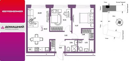 Продается 3комнатная квартира на 9 этаже от застройщика Страна Девелопмент. Площадь квартиры 58,61 кв. м.