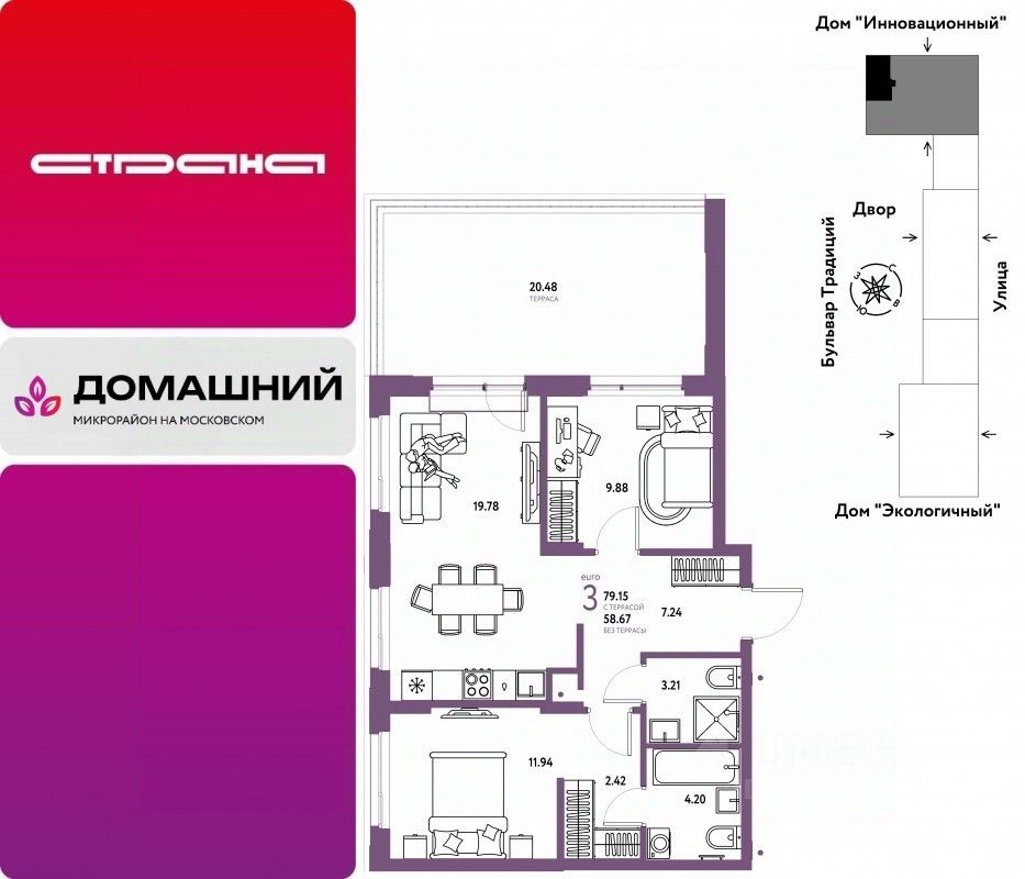 Продается 3комнатная квартира на 8 этаже от застройщика Страна Девелопмент. Площадь квартиры 79,15 кв. м.