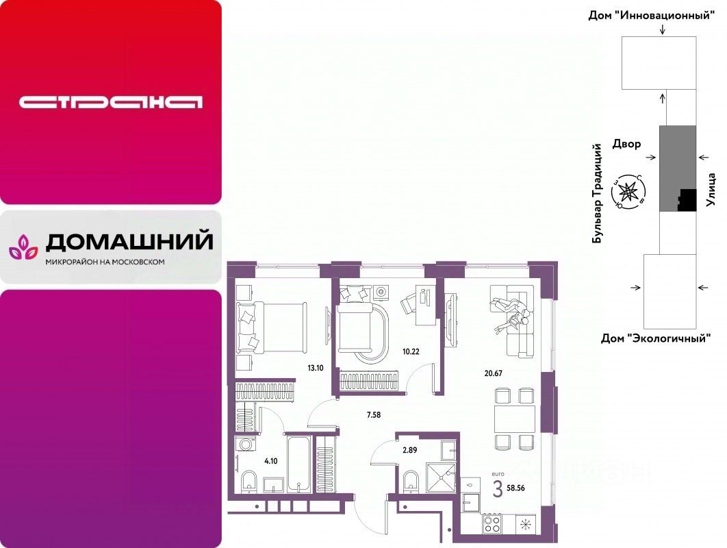 Продается 3комнатная квартира на 8 этаже от застройщика Страна Девелопмент. Площадь квартиры 58,56 кв. м.