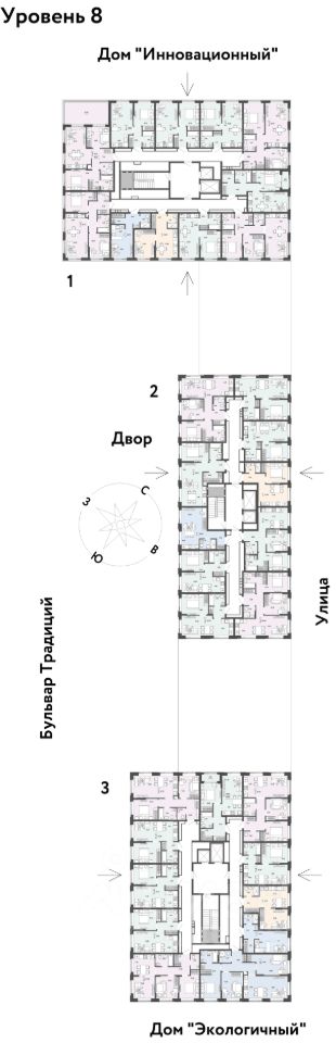 Внутри микрорайона появится огромный пешеходный бульвар — бульвар Традиций. Центром притяжения станут открытые пространства для отдыха жителей и гостей микрорайона, которые легко меняются под сезонные сценарии отдыха: новогодняя елка, ярмарки, кинопоказы и т.д.