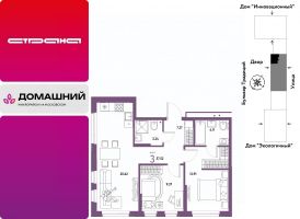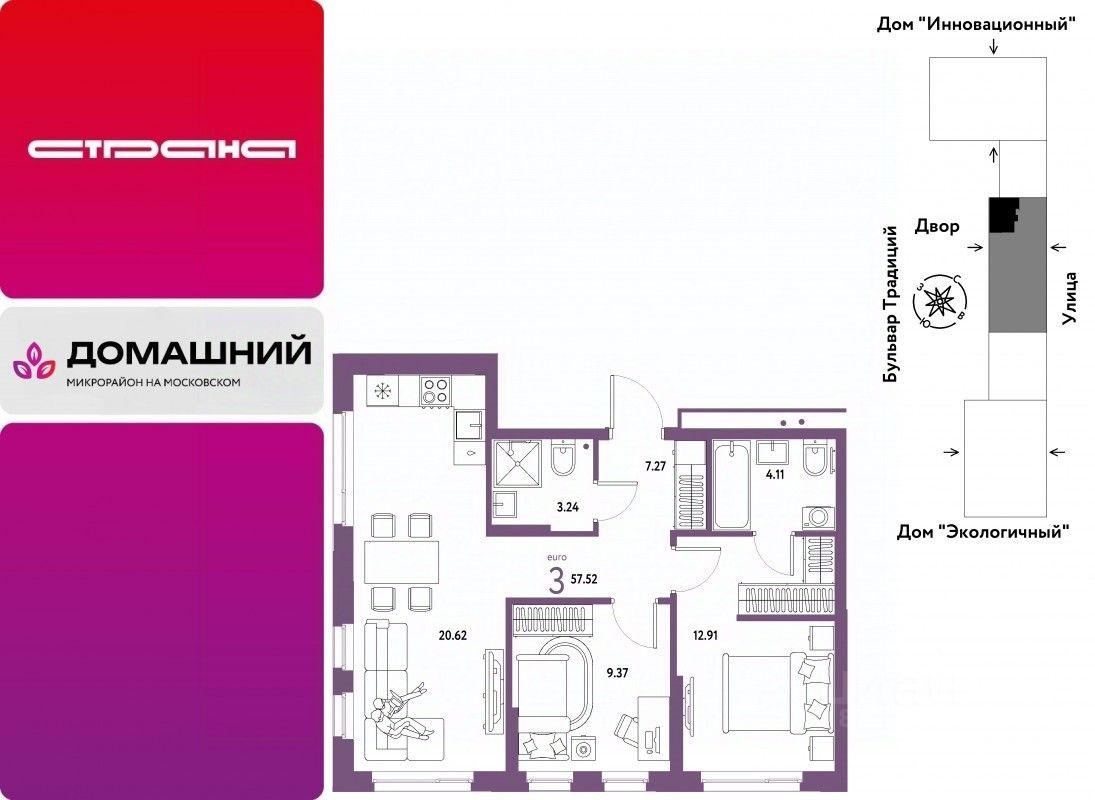 Продается 3комнатная квартира на 14 этаже от застройщика Страна Девелопмент. Площадь квартиры 57,52 кв. м.