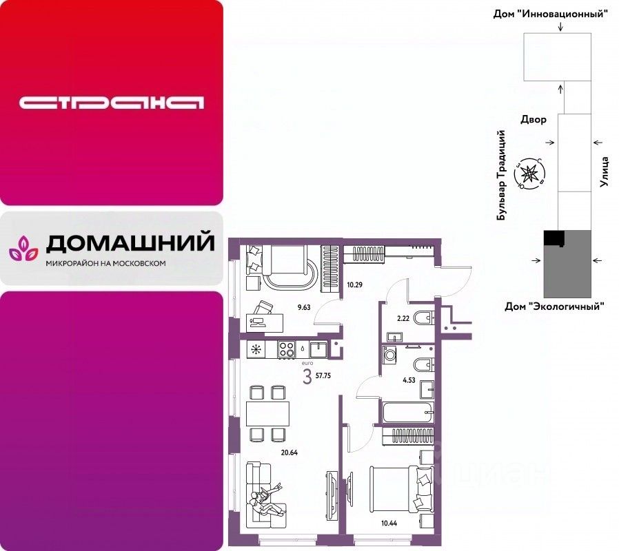 Продается 3комнатная квартира на 15 этаже от застройщика Страна Девелопмент. Площадь квартиры 57,75 кв. м.