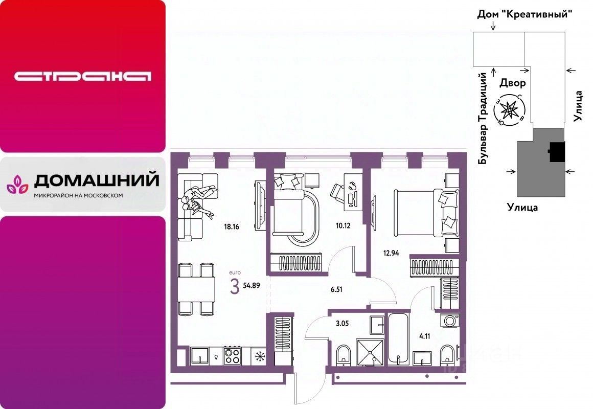 Новая квартира в ЖК "Домашний" напрямую от федеральной группы компаний "Страна Девелопмент". Финансовый партнер — банк "ДОМ.РФ".